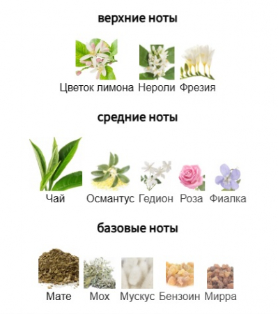 Верхние ноты: Цветок лимона, Нероли и Фрезия; средние ноты: Чай, Османтус, Гедион, Роза и Фиалка; базовые ноты: Мате, Мускус, Мох, Бензоин и Мирра.