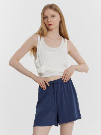 Шорты женские свободного силуэта из ткани. На детали переда карманы с отрезным бочком.