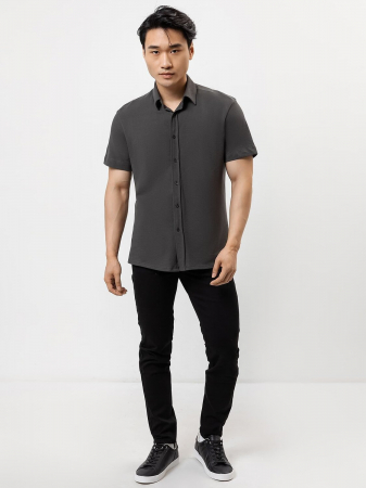 Сорочка верхняя мужская изготовлена из трикотажного полотна. Сорочка прямого силуэта, длиной до середины бедер. Плечевые швы смещены в сторону переда. Рукава втачные короткие , нижний срез рукава обработан швом вподгибку. Горловина округлой формы с рубашечным воротником, отложным на стойке. По переду обработана застежка на планке на петли и пуговицы. Спинка с отрезной горизонтальной кокеткой. Нижняя деталь спинки с вытачками. Нижний срез сорочки фигурный обработан швом вподгибку.