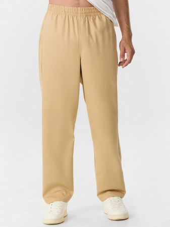Брюки прямые, посадка средняя. Пояс цельнокроёный с эластичной тесьмой внутри. С внутренней стороны пробиты петли и втянут шнур с застроченными концами (10PXC-1). На левой детали переда имитация гульфика. По переду карманы с отрезными бочками. Нижние срезы брюк обработаны швом вподгибку. На деталях спинки накладные карманы.