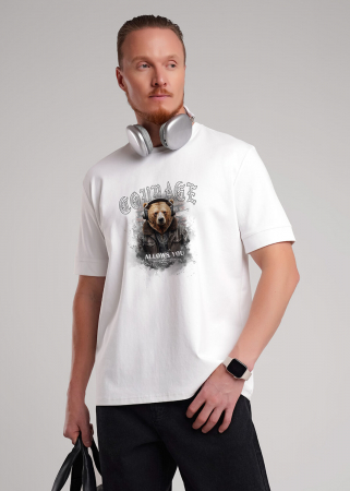 Футболка увеличенного объема из трикотажного плотного, гладкого полотна. Короткие рукава с манжетами. Изделие дополнено дизайнерским принтом. Отличный вариант для встреч с друзьями.