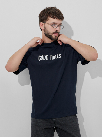 Синяя мужская футболка с надписью «Good times» («Хорошие времена») создана для тех, кто ценит стиль и комфорт. Модель оверсайз со спущенной линией плеча и короткими рукавами легко сочетается с любым низом.