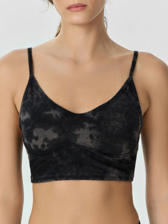 Топ облегающего силуэта, на узких бретелях. Горловина V-образной формы. Топ на подкладке из сетки, с чашками-вкладышами. Горловина и проймы окантованы бейкой из основного полотна. Бейки по проймам переходят в бретель, с регулировкой по длине (кольца и регуляторы). Топ с фигурным подрезом под грудью. В бретелях, окантовке горловин и пройм, по фигурному подрезу, эластичная тесьма. Нижний срез обработан швом вподгибку с эластичной тесьмой внутри