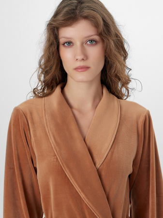 Бархатистый велюр с добавлением эластана мягко облегает фигуру, сохраняя тепло и даря невероятные тактильные ощущения. В этом халате так приятно пить утренний кофе, читать книгу вечером или встречать близких — вы всегда будете выглядеть собранной и элегантной даже в моменты отдыха.
