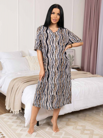 Халат прямого силуэта на молнии, с накладными карманами, коротким рукавом и О-образной горловиной.