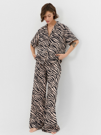 Женская домашняя пижама из рубашки и брюк создана для тех, кто ценит уют и комфорт. Натуральный хлопок обеспечивает нежность и воздухопроницаемость, даря коже приятные ощущения и полную свободу движений. Рубашка свободного кроя с отложным воротником и короткими рукавами выглядит стильно и элегантно. Классическая застежка на пуговицы удобна в использовании, а аккуратная обработка всех краев обеспечивает долговечность носки.