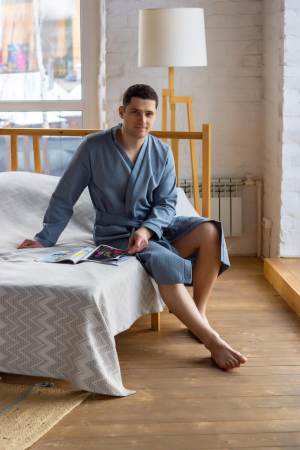 Негоже главе семейства расхаживать после душа, укутавшись в обычное полотенце. Чтобы стряхнуть остатки влаги после приятия ванны, достаточно надеть халат из вафельного полотна. Модель «на запах», в комплекте прилагается пояс. Халат оснащен глубокими карманами для обеспечения максимального комфорта.