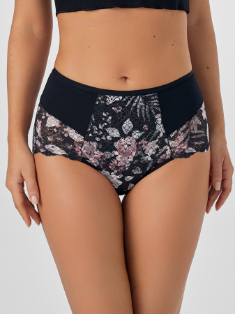 Трусы женские макси с высокой посадкой из кулирного полотна и эластичного кружева. Перед с вертикальным и горизонтальным членением. Передняя центральная деталь из кулирного полотна с наложением наверх эластичного кружева. Ластовица отрезная на подкладке из основного полотна. Срезы ластовицы обработаны эл тесьмой 6 мм (жилка тканая Wt4-6, девсел 13460 W) с наложением на лицевую сторону полотна и с узким верхним застилом в край. Задняя деталь со средним швом и с горизонтальным членением. Вертикальные и горизонтальные швы собраны на ширителе. Верхний срез обработан эластичной тесьмой 10 мм (жилка тканая Wt4-10, девсел 13460 W) с наложением на лицевую сторону полотна и с узким верхним застилом в край.