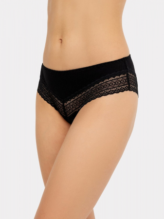 Трусы женские силуэта слип со средней посадкой из рибаны. По талии эластичная тесьма с зубом настрочена на 4-укольном зигзаге. Ножки обработаны узким кружевом шириной, на передней и задней частях со средним швом. Подкладка ластовицы из кулирной глади. Срезы ластовицы обработаны эластичной тесьмой с зубом на п/ш с изнаночной стороны.