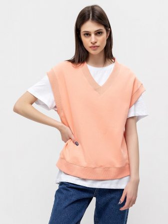 Жилет оверсайз из футера с начесом со спущенным плечом и V-образной горловиной, длиной до линии бедер.