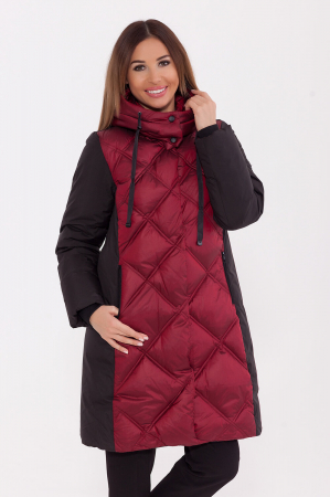 Стеганое пальто средней длины с контрастной отделкой. Интересная стежка в в виде увеличивающихся к низу квадратов. Скрытая молния и потайные кнопки. Воротник-стойка с потайными кнопками. Уютный капюшон с затяжкой –кулиской отстегивается. Функциональная кулиска также расположена и по низу пальто.