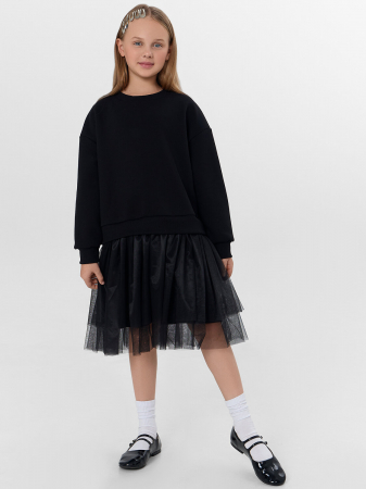 Платье для девочек свободного силуэта. Рукава втачные длинные, с отрезными манжетами из рибаны. Плечо слегка спущено. Горловина округлый формы с обтачкой из рибаны. Низ изделия обработан рибаной .