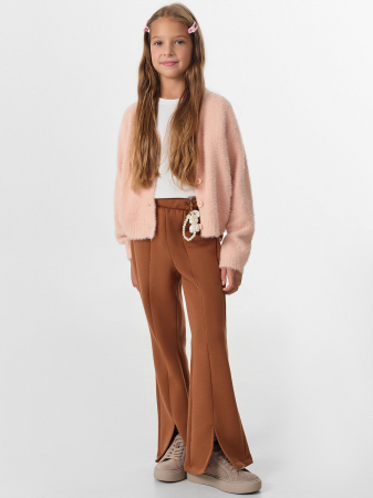 Фасон плавно расширяется книзу, создавая элегантную расклешенную линию. Особый шарм брюкам придают декоративный шов по центру и аккуратные разрезы внизу — эти детали делают модель непохожей на другие.