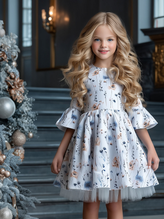 Нарядное платье для девочки из кулира - хлопкового тонкого набивного полотна. Изделие прилегающего силуэта, с рукавами длиной 3/4 с оборками и отрезной пышной юбкой. Подъюбник выполнен из сетки. Уход: ручная стирка при температуре не более 40 градусов, без предварительного замачивания.