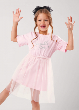 Нарядное платье с сеткой абсолютная находка для юных модниц! Пышная юбка из сетки,короткий летящий рукав,и подклад платья - из хлопка с эластаном. Платье дополнено мерцающим принтом спереди.