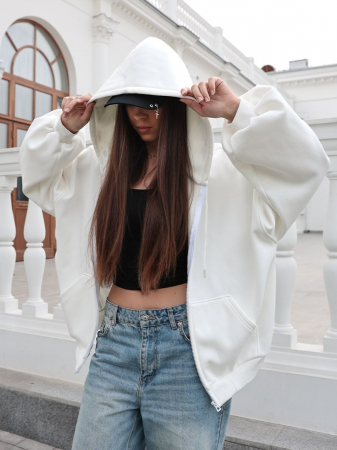 Толстовка Соль&Перец, свободного кроя оверсайз. Выполнена из плотного и эластичного материала «лининг с начесом», который хорошо пропускает воздух, не теряет форму и приятный к телу. Толстовка по всей длине на молнии, с капюшоном и карманом кенгуру. Рукава и низ толстовки с широкими, эластичными манжетами.
