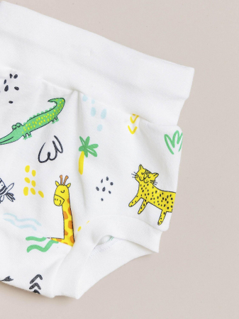 Трусы для девочки белые с принтом из ткани интерлок пенье. Трусики для малышей выполнены из мягкого хлопка высшего качества, подойдут в качестве носки на подгузник. Выполнены из легкого трикотажного полотна, в составе которого хлопок 100%, обеспечивающий максимальную мягкость при использовании. Широкая эластичная резинка и яркий принт в виде животных.