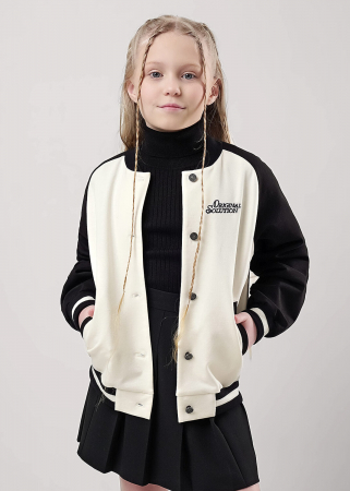 Стильный контрастный бомбер из футера станет модной новинкой в твоём гардеробе! Модель выполнена в стиле "колледж" и отлично подходит для создания классных повседневных образов и посещения школьных занятий.