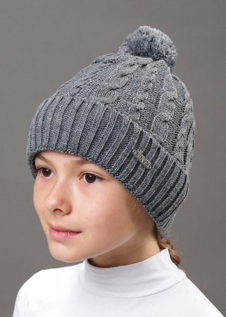Детская шапка на флисовом подкладе, выполнена фактурным переплетением "косы" из акриловой пряжи и декорирована ниточным помпоном и нашивкой на отвороте.