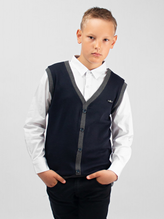 Джемпер-обманка с имитацией рубашки. Жилет с V-образным вырезом, выполнен из мягкого, приятного к телу трикотажа. По низу изделия - манжет. Имитация рубашки так же выполнена из натурального материала, на груди застегивается на две пуговицы. Идеальный выбор для создания классического школьного образа.