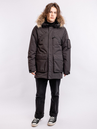 Зимняя парка для мальчиков Алан в черном цвете актуального силуэта оверсайз представляет собой микс спортивного и городского стиля. Выполнена из плотной мембранной ткани, которая защищает от ветра и влаги. Удлинённая спинка, внутренняя и внешняя ветрозащитная планка. Рукав кроя реглан с внутренней трикотажной манжетой с отверстием для пальца регулируется по ширине. Объемный декоративный карман с молнией и оригинальной нашивкой на левом рукаве. Несколько объемных карманов с клапаном на магнитах на теплой подкладке. Кпюшон со съемной опушкой регулируется по ширине и высоте, внутри подклад из мягкого ворсового трикотажа. Все открытые срезы предусматривают защиту от поддува за счет утяжек. Светоотражающие элементы по принципу 360 градусов видимости обеспечат безопасность в темное время суток.