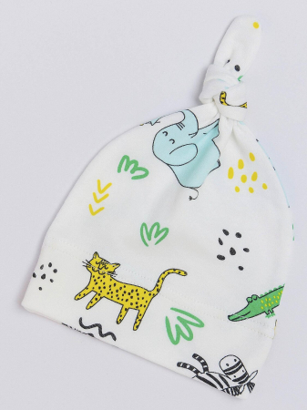 Шапочка для новорожденного трикотажная с узелком и милым "звериным" принтом. Выполнена из натурального хлопка - ткани интерлок пенье. Подойдет для малышей от 0 до 9 месяцев.
