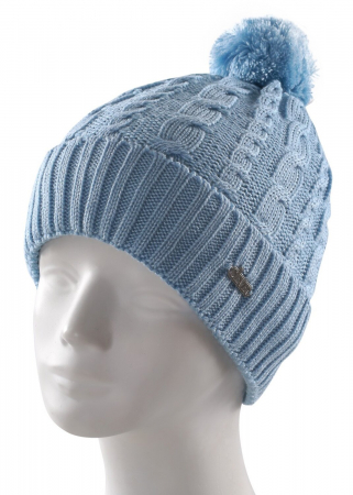 Детская шапка на флисовом подкладе, выполнена фактурным переплетением "косы" из акриловой пряжи и декорирована ниточным помпоном и нашивкой на отвороте.