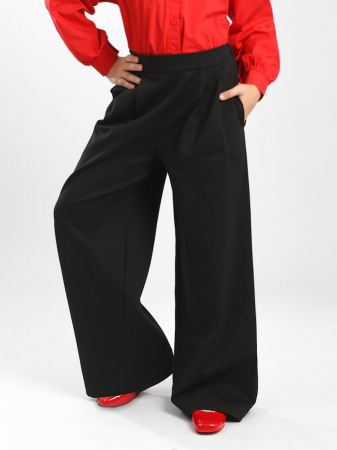 Брюки палаццо для девочки Соль&Перец, с карманами. Модель имеет расширяющийся от бедра силуэт, что визуально вытягивает фигуру. Брюки застёгиваются на потайную молнию сбоку, сзади в пояс вшита резинка. Брюки выполнены из износостойкой костюмной ткани «Босс» которая долго сохраняет форму и привлекательный внешний вид.