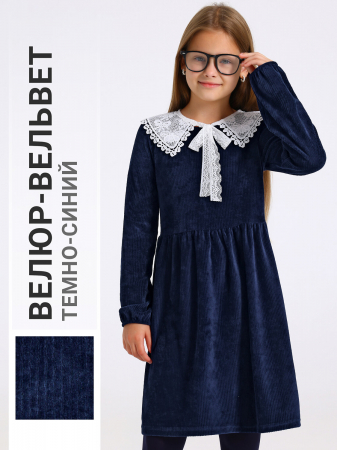 Школьное платье для девочки выполнено из мягкого вельвета в рубчик. Изделие отрезное по талии, с присборенной юбочкой и длинными рукавами. На спинке застежка на пуговицу. Уход: только машинная стирка (руками не стирать!) при температуре 40 градусов, без предварительного замачивания.