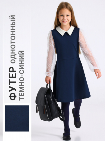 Платье для девочки выполнено из футера – мягкого плотного хлопкового полотна с лайкрой. Изделие полуприлегающего силуэта с юбкой-клеш и длинными рукавами из сетки, отрезное по линии талии, по спинке застежка на пуговицу, украшено аккуратным отложным воротником. Уход: только деликатная стирка при температуре 40 градусов, без предварительного замачивания.