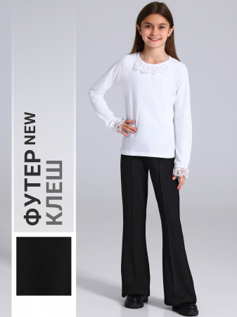 Школьные брюки-клёш для девочки выполнены из футера - тонкого хлопкового полотна с содержанием полиэстера. Изделие со средней высотой посадки, без карманов, декорировано острочками-стрелками. Уход: только машинная стирка (руками не стирать!) при температуре 40 градусов, без предварительного замачивания.