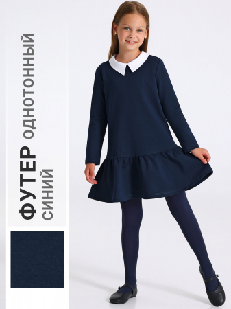 Платье для девочки выполнено из футера – плотного хлопкового полотна. Изделие трапециевидного силуэта с чуть спущенным плечом, с заниженной линией талии, с присборенной юбочкой. Рукава длинные, воротник отложной, на спинке застежка на пуговицу. Уход: только деликатная стирка при температуре 40 градусов, без предварительного замачивания.