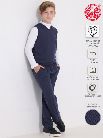 Стильный комплект из жилета и брюк выполнен из плотного полотна с рельефным рисунком, выполненным с применением жаккардового плетения. Трикотажный жилет с V-образным вырезом и эластичной вставкой по низу изделия. Брюки средней посадки на эластичном поясе имеют втачные карманы и отстрочки-стрелки. Прекрасный вариант для школы. Уход: только машинная стирка (руками не стирать!) при температуре 40 градусов, без предварительного замачивания.