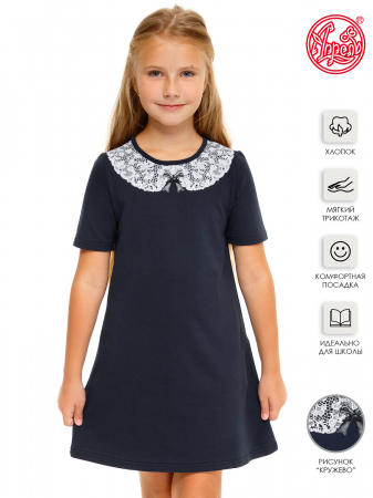 Платье для девочки выполнено из теплого хлопкового полотна с лайкрой. Изделие с короткими рукавами, с застежкой на пуговку по спинке, украшено печатью, имитирующей кружевной воротник. Отличный вариант для школы! Уход: только машинная стирка (руками не стирать!) при температуре 40 градусов, без предварительного замачивания. Изделия с печатью и декором перед стиркой необходимо вывернуть на изнаночную сторону.