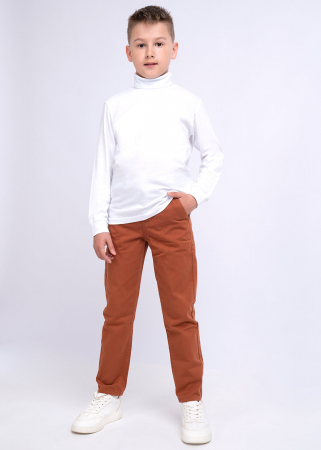 Брюки чиносы небольшого объема, выполнены из плотного поплина 100% хлопок. Впереди гульфик с застежкой на молнию, боковые карманы, сзади внутренние карманы в рамку. Пояс регулируется внутренней эластичной тесьмой и шлевками.