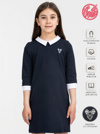 Платье для девочки выполнено из футера - плотного хлопкового полотна с лайкрой. Изделие с рукавами длиной 3/4, сзади застегивается на пуговку, декорировано отложным воротником и манжетами, украшено небольшой вышивкой. Отличный вариант для школьницы на каждый день! Уход: только машинная стирка (руками не стирать!) при температуре 40 градусов, без предварительного замачивания. Изделия с печатью и декором перед стиркой необходимо вывернуть на изнаночную сторону.