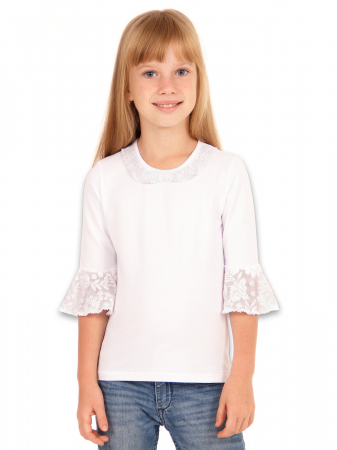 Лонгслив для девочки выполнен из кулира - легкого хлопкового полотна с лайкрой. Изделие с рукавами длиной 3/4 украшенными кружевом, декорировано отложным воротником. Отличный вариант для школьницы на каждый день! Уход: только машинная стирка (руками не стирать!) при температуре 40 градусов, без предварительного замачивания.