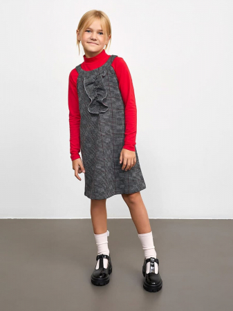 Сарафан для девочки, расширеного силуэта из трикотажного полотна академик.Горловина круглой формы. Пройма американская. По центру передней детали настрочен декоративный воротник “жабо”. Длина сарафана чуть выше колена.