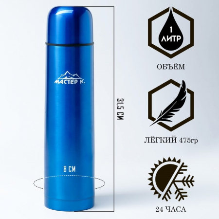 Термос 1 л "Мастер К" изготовлен из высококачественной нержавеющей стали, имеет двойные стенки, обеспечивающих вакуумную термоизоляцию. Легкий и прочный термос "Мастер К" сохранит ваши напитки горячими или холодными надолго. Это идеальный выбор для тех, кто хочет наслаждаться горячими напитками во время отдыха на природе или в поездках, напиток останется теплым и свежим, готовым к наслаждению в любой момент. Термосы этой серии пользуются большой популярностью у активных и динамичных пользователей, а также у любителей охоты и рыбалки, так как они, сохраняют прочность и термоустойчивость, легки и компактны.