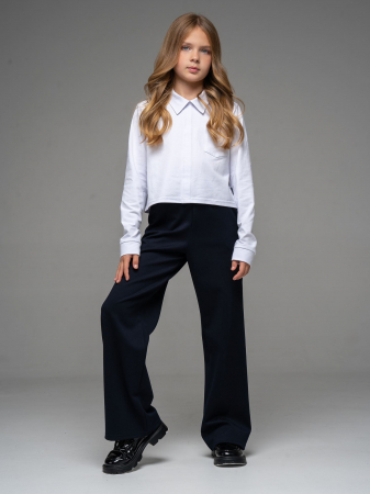 Стильные брюки-палаццо с боковыми карманами из джерси темно-синего цвета для девочки. Цельнокроенный пояс на эластичной резинке.