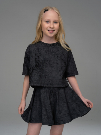 Костюм двойка из кулирки черного цвета для девочки. Состоит из футболки свободного силуэта со спущенной линией плеча, рукавами до уровня локтя и расклешенных шорт. Костюм двойка- это отличный выбор для создания модного и стильного летнего образа. Превосходное сочетание практичности и удобства, этот костюм станет незаменимым элементом гардероба Вашей девочки. Привлекательный, летний дизайн и свободная посадка обеспечивают комфорт даже в самые жаркие дни.