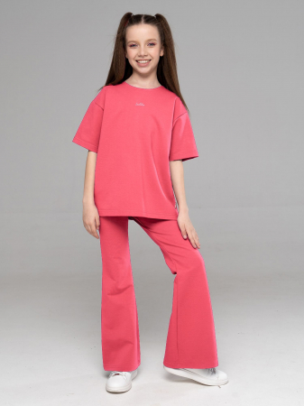 Костюм двойка для девочки из футера кораллового цвета для девочки состоит из футболки свободного силуэта со спущенной линией плеча, рукавами до уровня локтя и брюк- клеш. На груди- небольшой принт. Костюм двойка- это отличный выбор для создания модного и стильного летнего образа. Превосходное сочетание практичности и удобства, этот костюм станет незаменимым элементом гардероба Вашей девочки. Привлекательный, летний дизайн и свободная посадка обеспечивают комфорт даже в самые жаркие дни.
