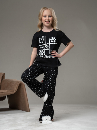 Пижама из интерлока черного цвета для девочки свободного силуэта . Состоит из футболки и брюк . Футболка с расширенной линией плеча, округлой горловиной и длинными рукавами. Прямые брюки с цельнокроенным поясом на резинке без бокового шва.
