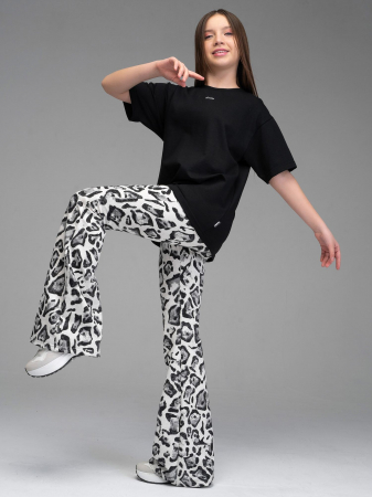 Стильные брюки-клеш из футера черного цвета для девочки, облегающие по бедрам и расклешенные от колена. Пояс на эластичной резинке. Изделие выполнено из трикотажа премиального качества - ПЕНЬЕ, с содержанием хлопка более 92%
