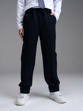 Школьные брюки "унисекс" из джерси темно-синего цвета прямого силуэта с боковыми карманами и имитацией гульфика . Детские брюки выполненые из трикотажа премиального качества - ПЕНЬЕ, с содержанием хлопка 92% .Брюки очень комфортны - без молнии и пуговиц, на эластичном поясе. Брюки на резинке не давят на живот, их легко снимать, переодеваясь на физкультуру. Трикотажные брюки имеют застроченные складки - Вам не придется каждый вечер отглаживать стрелки. Классические брюки при необходимости можно носить с ремнем, для этого на поясе имеются шлевки. Трикотажные хлопковые штаны приятны к телу, в них Вашему ребенку не будет жарко целый день сидеть за партой, а также они очень легки в уходе. Детские брюки идеально подойдут как для непоседливых учеников начальных классов, так и для страшеклассников, Трикотаж не мнётся и хорошо сохраняет форму при длительной носке. Изделие выполнено из трикотажа премиального качества - ПЕНЬЕ.