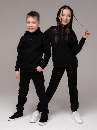 Теплый костюм из футера с начесом черного цвета , в спортивном стиле. Удлиненная толстовка свободного силуэта с капюшоном и длинными рукавами. Спереди - небольшой минималистичный принт. Стильные зауженные брюки с боковыми карманами. Рукава,низ толстовки и низ брюк - на манжетах. Изделие выполнено из трикотажа премиального качества - ПЕНЬЕ, с содержанием хлопка более 80%