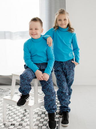 Брюки прямого силуэта из мембраны с флисовой подкладкой темно-синего цвета . Мембранное покрытие обеспечивает сохранение тепла и воздухообмен. Передние половинки брюк украшены отделочными строчками и имитацией гульфика. Брюки с боковыми карманами. Задняя часть брюк на кокетке. Пояс составной - передняя часть из основного материала, боковая и задняя часть пояса из резинки. Низ брюк на эластичной резинке.
