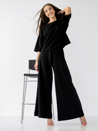 Укороченная футболка из футера черного цвета свободного силуэта со спущенной линией плеча. Широкие рукавас отворотами до линии локтя. Изделие выполнено из трикотажа премиального качества - ПЕНЬЕ, с содержанием хлопка более 92%