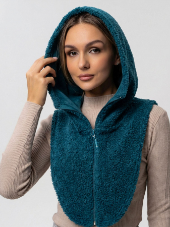 Капор женский на молнии из шерпа петроль цвета - тренд сезона. Это универсальный головной убор, который сочетается с любой верхней одеждой, создавая стильный образ. Это отличная замена шапке, платку и шарфу, надежно закрывает шею и грудь от холодного воздуха. Плюшевый теплый капор из шерпы - идеален для длительных прогулок на свежем воздухе, путешествий, занятий спортом. В нем можно каждый день ходить на работу в офис, на учебу в школу или в институт. Не имеет ограничений по возрасту, подходит как взрослым, так и подросткам для повседневного, спортивного, городского, молодежного стиля. Капор-манишку можно взять с собой и надеть в случае непогоды весной и осенью.