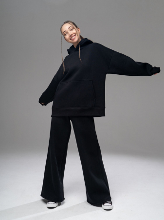 Женский костюм-двойка ,состоит из толстовки и брюк-палаццо. Толстовка в стиле "оверсайз" свободного силуэта с капюшоном и длинными рукавами. Спереди - большой карман-кенгуру. Капюшон объемный двойной. Рукава и низ изделия на эластичных манжетах. Брюки-палаццо свободного кроя с цельнокроенным широким поясом и карманами в боковых швах. Изделие выполнено из трикотажа премиального качества - ПЕНЬЕ, с содержанием хлопка более 80%